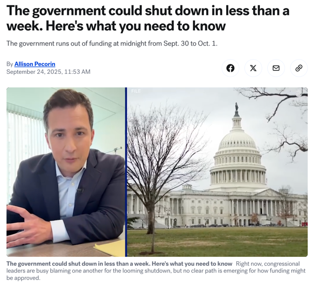 随着两份方案先后告吹,时间窗口不断被压缩。9月下旬的大部分时间,国会又都处于休会状态,于是真正可用来协商和投票的工作日,就被压缩到了月末的最后两三天。