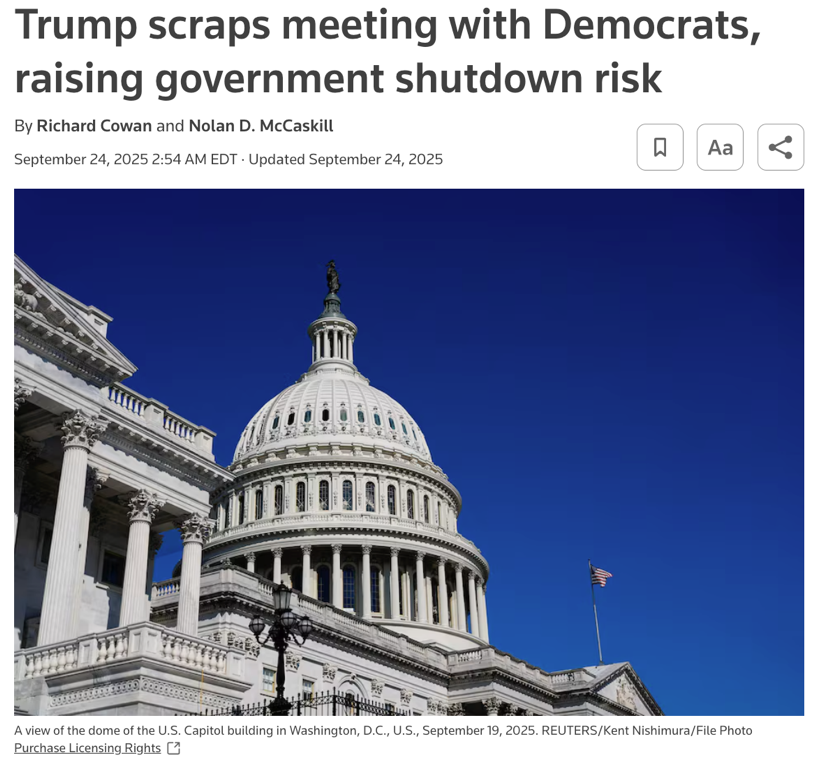 △路透社报道,特朗普9月23日取消了原定与民主党高层领导讨论临时拨款问题的会议,这增加了政府关门的风险。